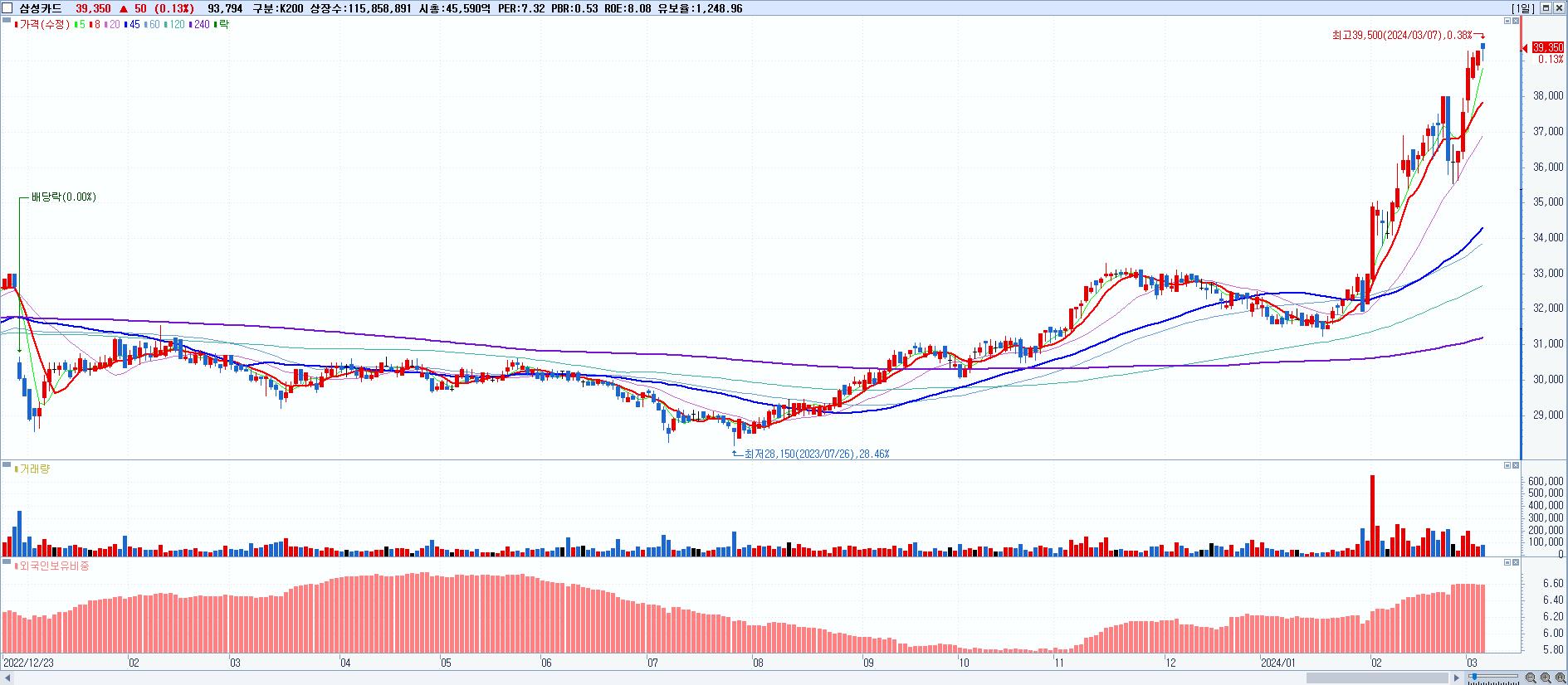 삼성카드 39,350원 ▲ 0.13% (KOSPI, 029780)