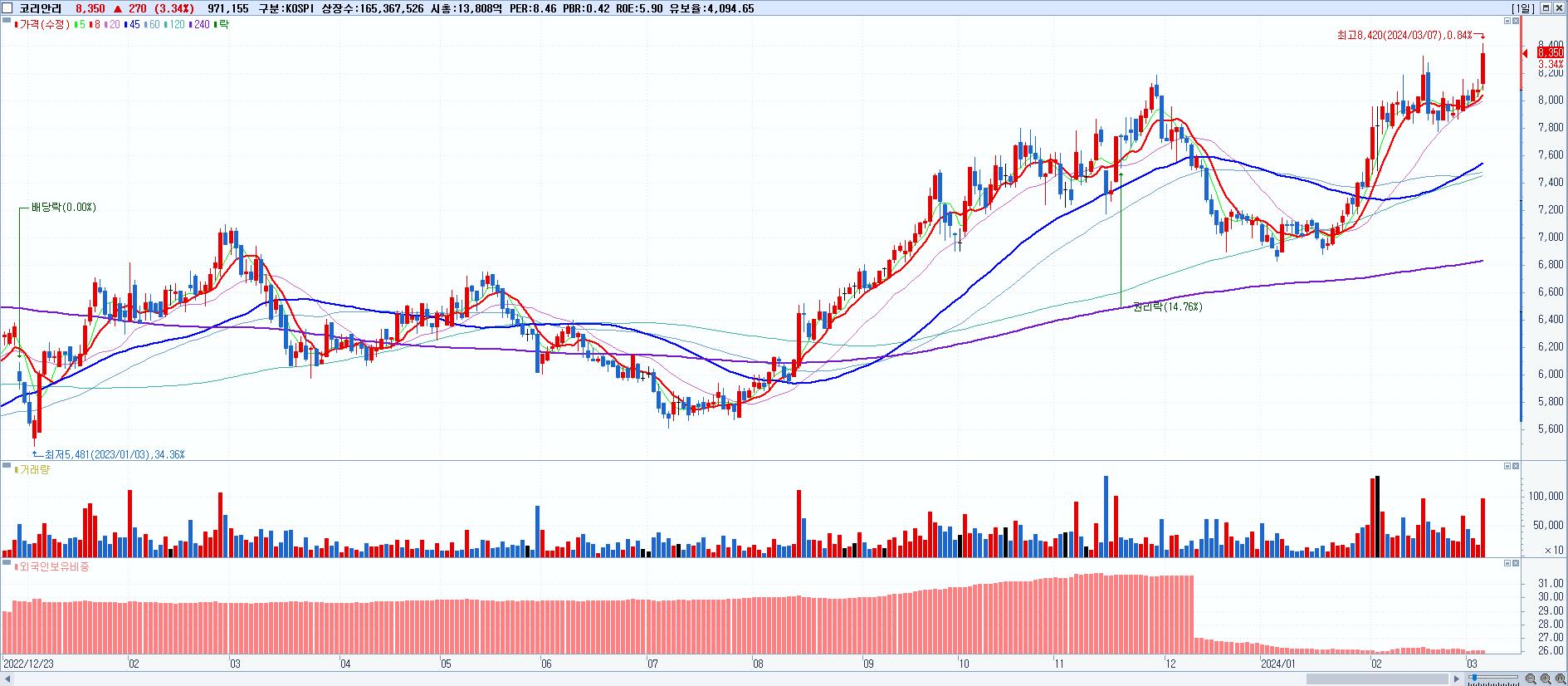 - 코리안리 (8,350원 ▲ 3.34% , 시총: 13,808억, 거래량: 971,155, 거래대금:81억, KOSPI)
