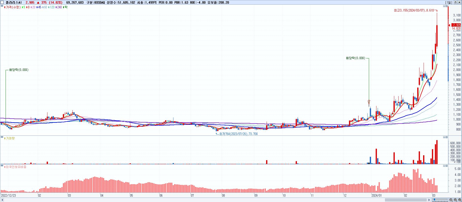 - 폴라리스AI (2,905원 ▲ 14.82% , 시총: 1,499억, 거래량: 69,267,603, 거래대금:1,987억, KOSDAQ)