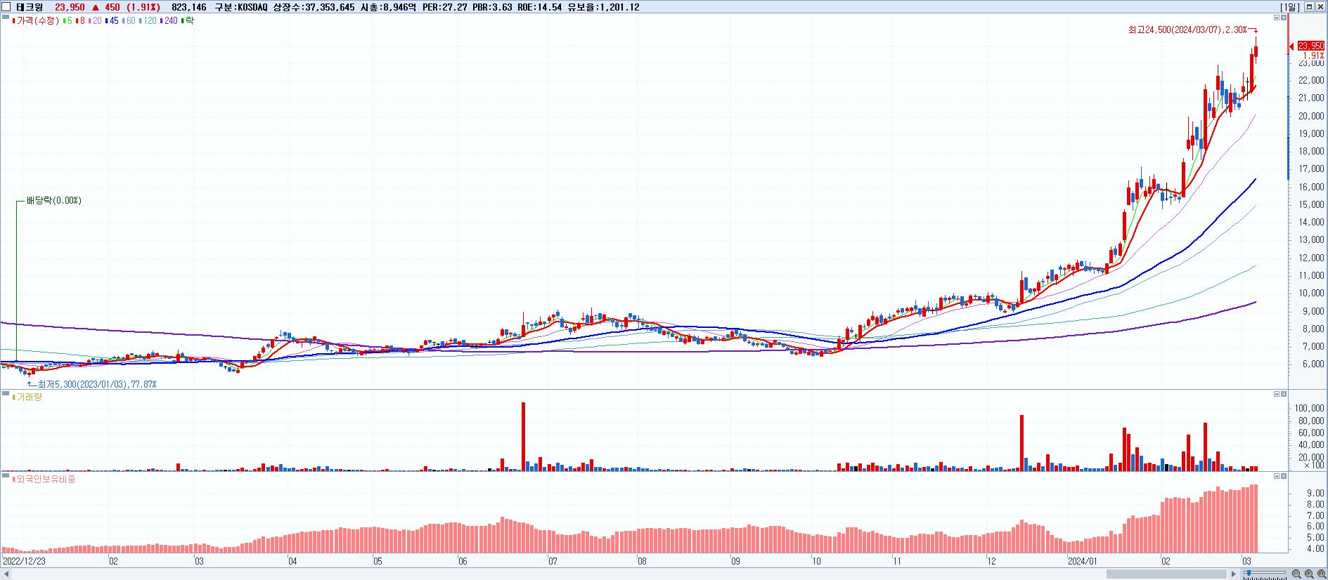 - 테크윙 (23,950원 ▲ 1.91% , 시총: 8,946억, 거래량: 823,146, 거래대금:197억, KOSDAQ)