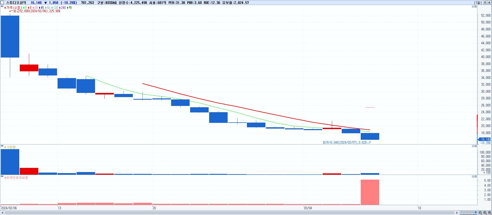 - 스튜디오삼익 (16,140원 ▼ -10.28% , 시총: 682억, 외국인 순매수 거래금:36억)