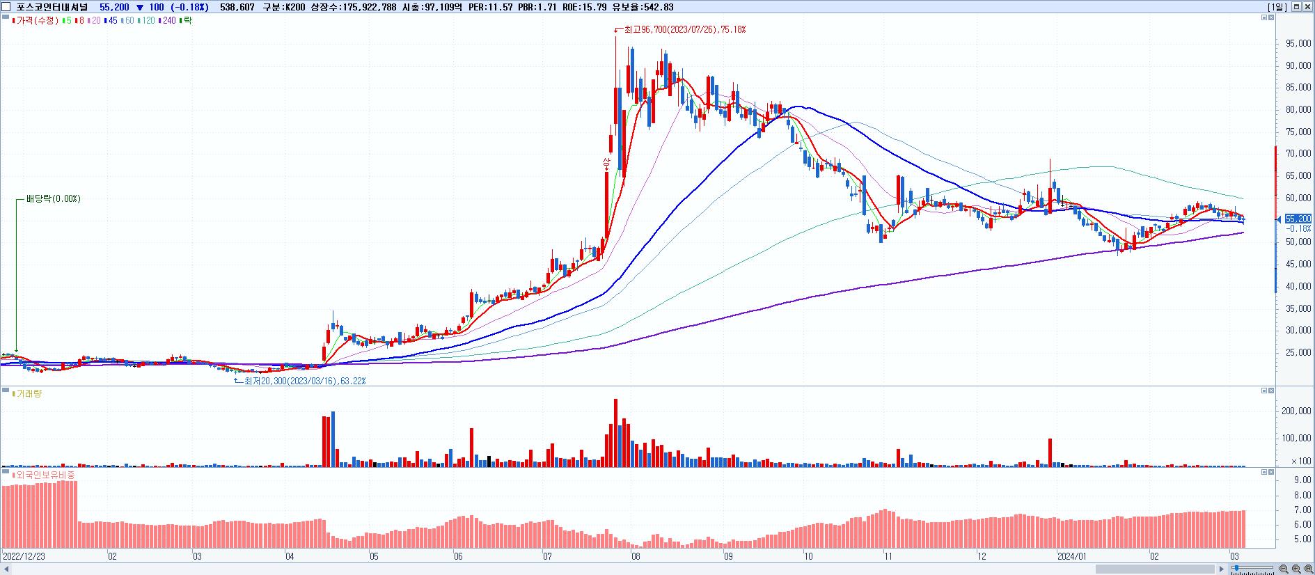 - 포스코인터내셔널 (55,200원 ▼ -0.18% , 시총: 97,109억, 외국인 순매수 거래금:48억)