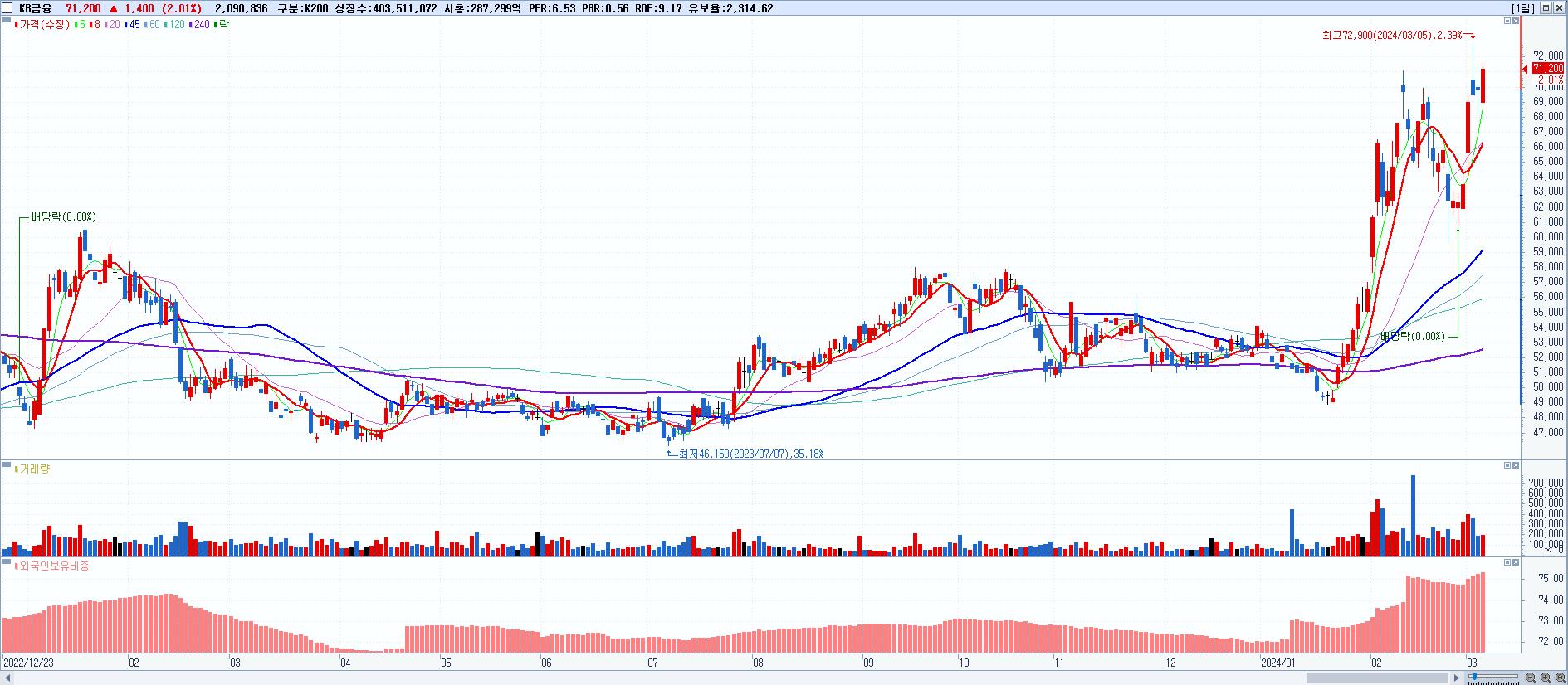 - KB금융 (71,200원 ▲ 2.01% , 시총: 287,300억, 외국인 순매수 거래금:215억)