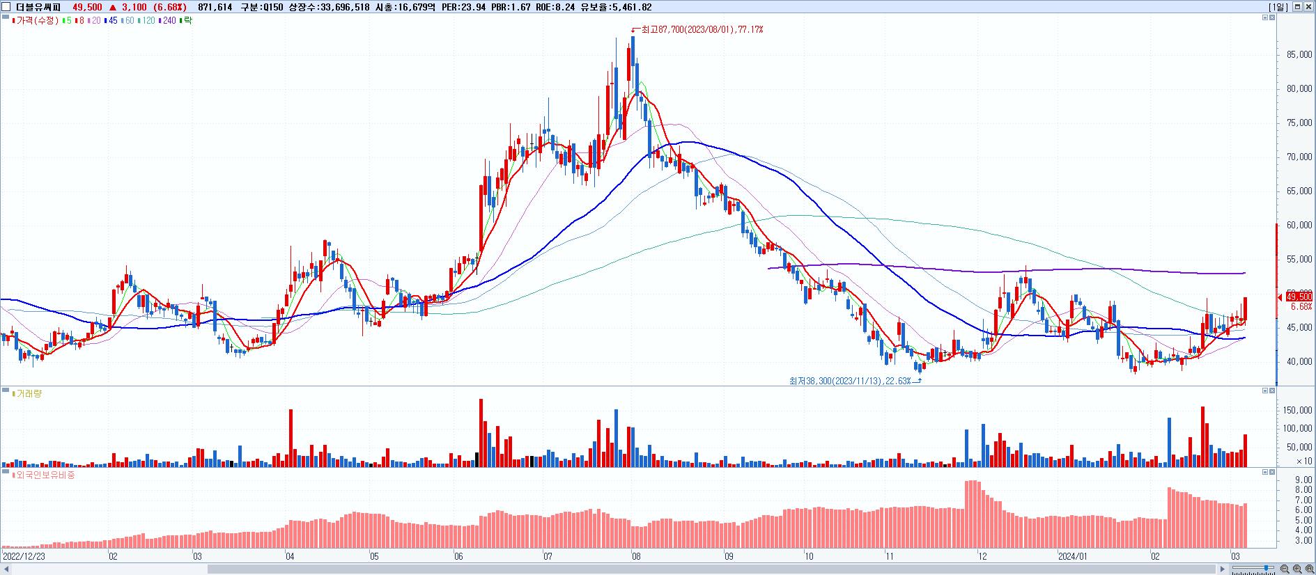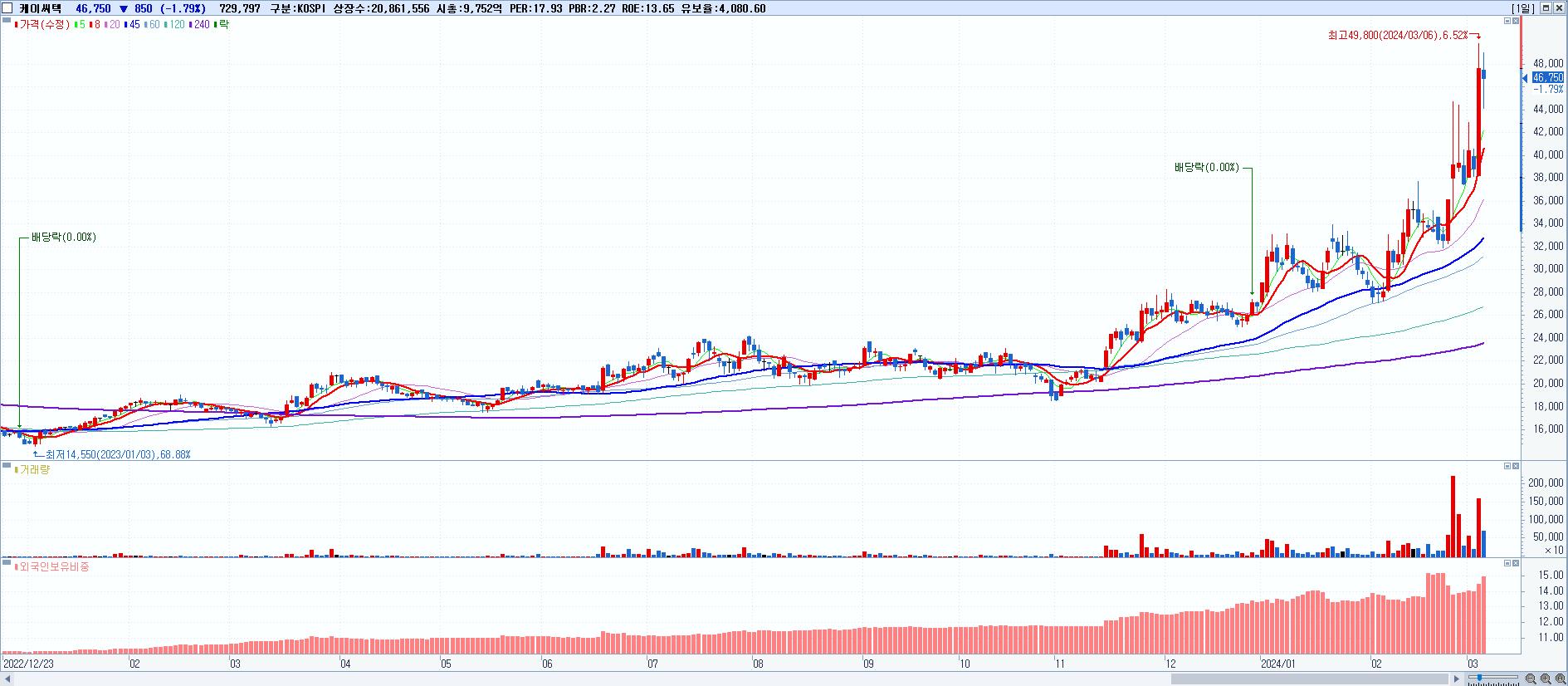 - 더블유씨피 (49,500원 ▲ 6.68% , 시총: 16,680억, 외국인 순매수 거래금:52억)