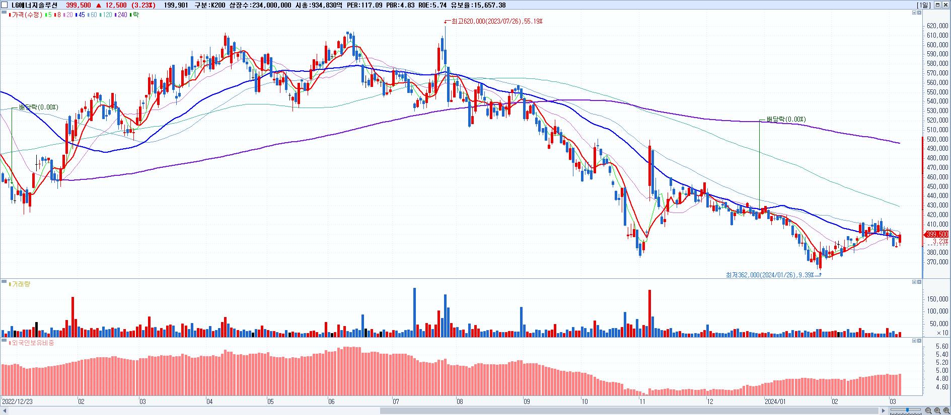 - LG에너지솔루션 (399,500원 ▲ 3.23% , 시총: 934,830억, 외국인 순매수 거래금:168억)