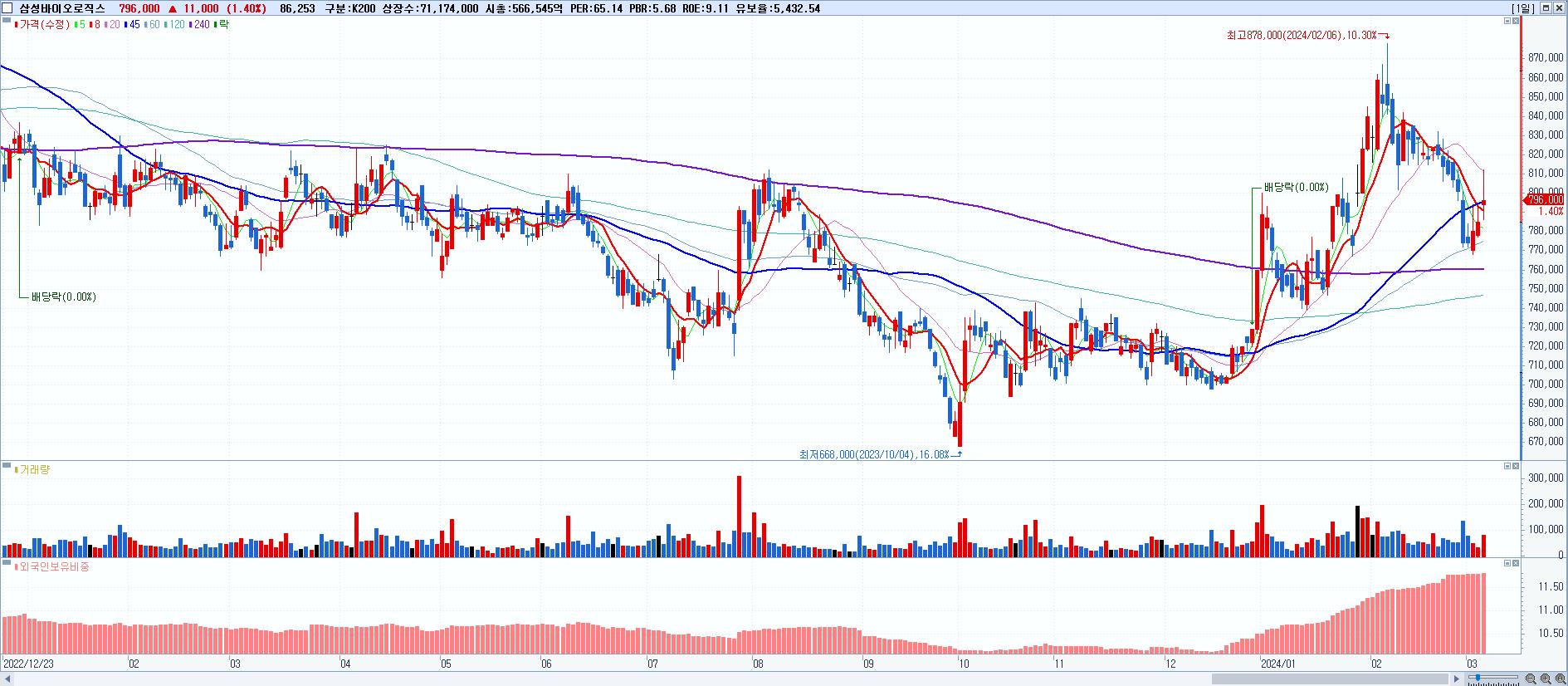- 삼성바이오로직스 (796,000원 ▲ 1.4% , 시총: 566,545억, 외국인 순매수 거래금:92억)