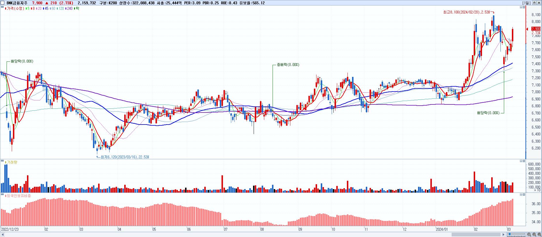 - BNK금융지주 (7,900원 ▲ 2.73% , 시총: 25,445억, 외국인 순매수 거래금:37억)