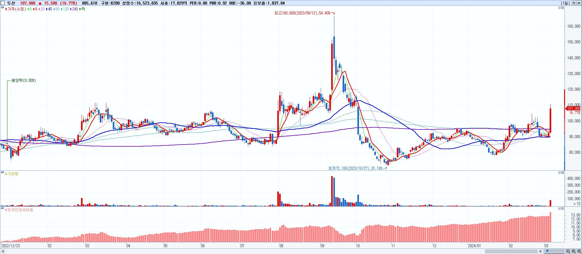 - 두산 (107,900원 ▲ 16.77% , 시총: 17,829억, 외국인 순매수 거래금:174억)