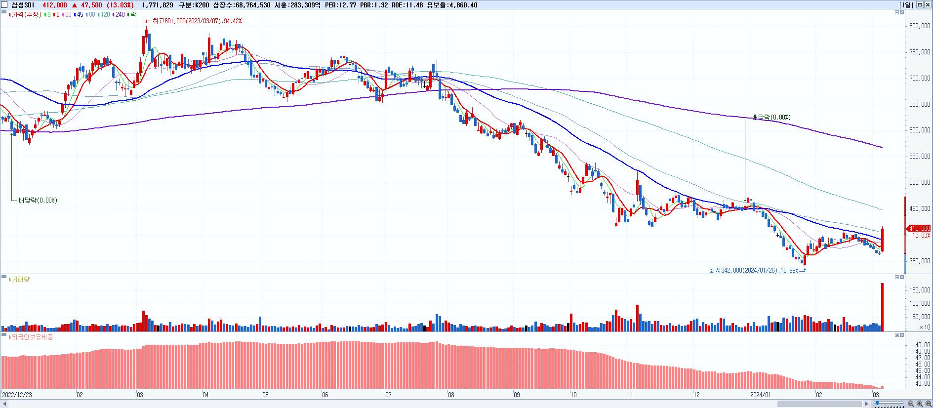 1.삼성SDI 412,000원 ▲ 13.03% (KOSPI, 006400)