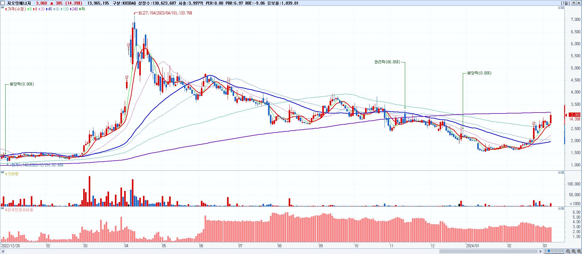 - 지오릿에너지 (3,060원 ▲ 14.39% , 시총: 3,997억, 거래량: 13,965,195, 거래대금:421억)