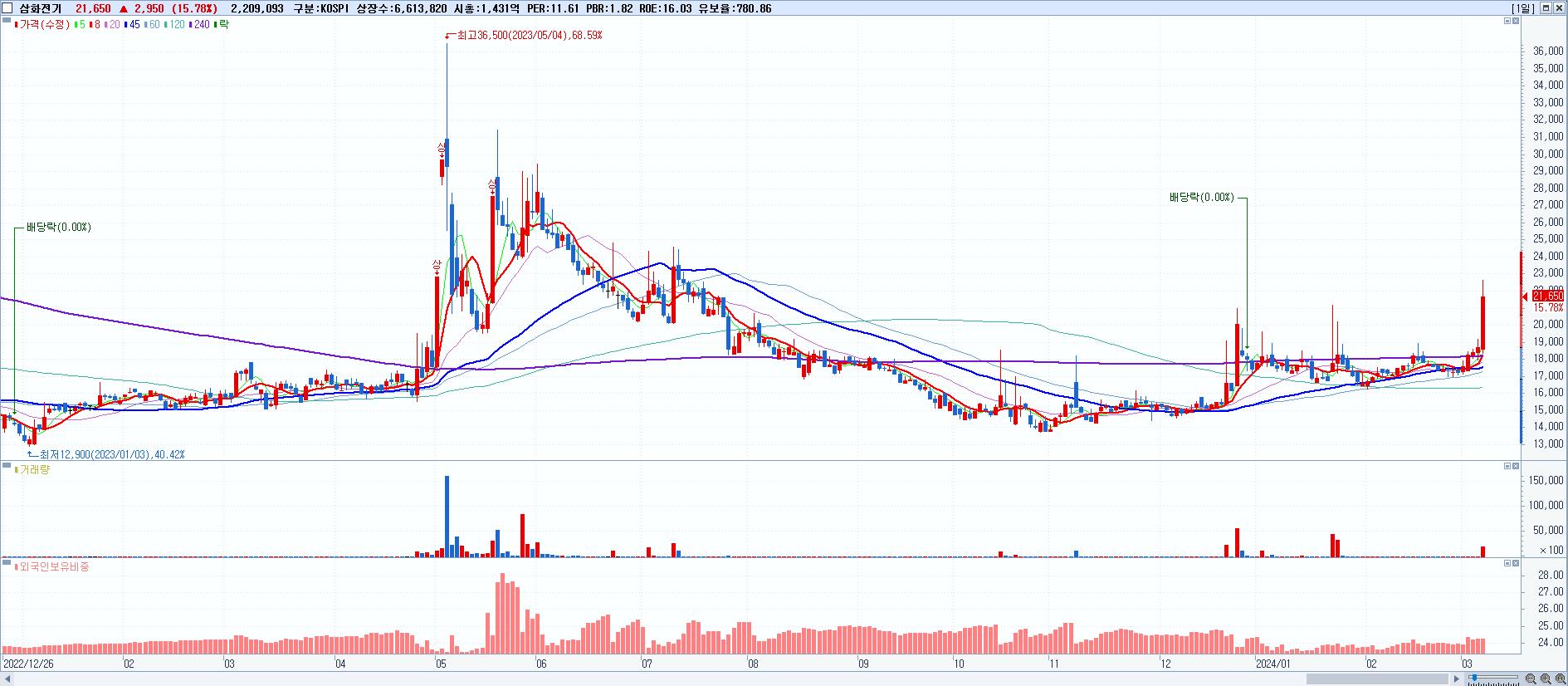 - 삼화전기 (21,650원 ▲ 15.78% , 시총: 1,432억, 거래량: 2,209,093, 거래대금:468억)