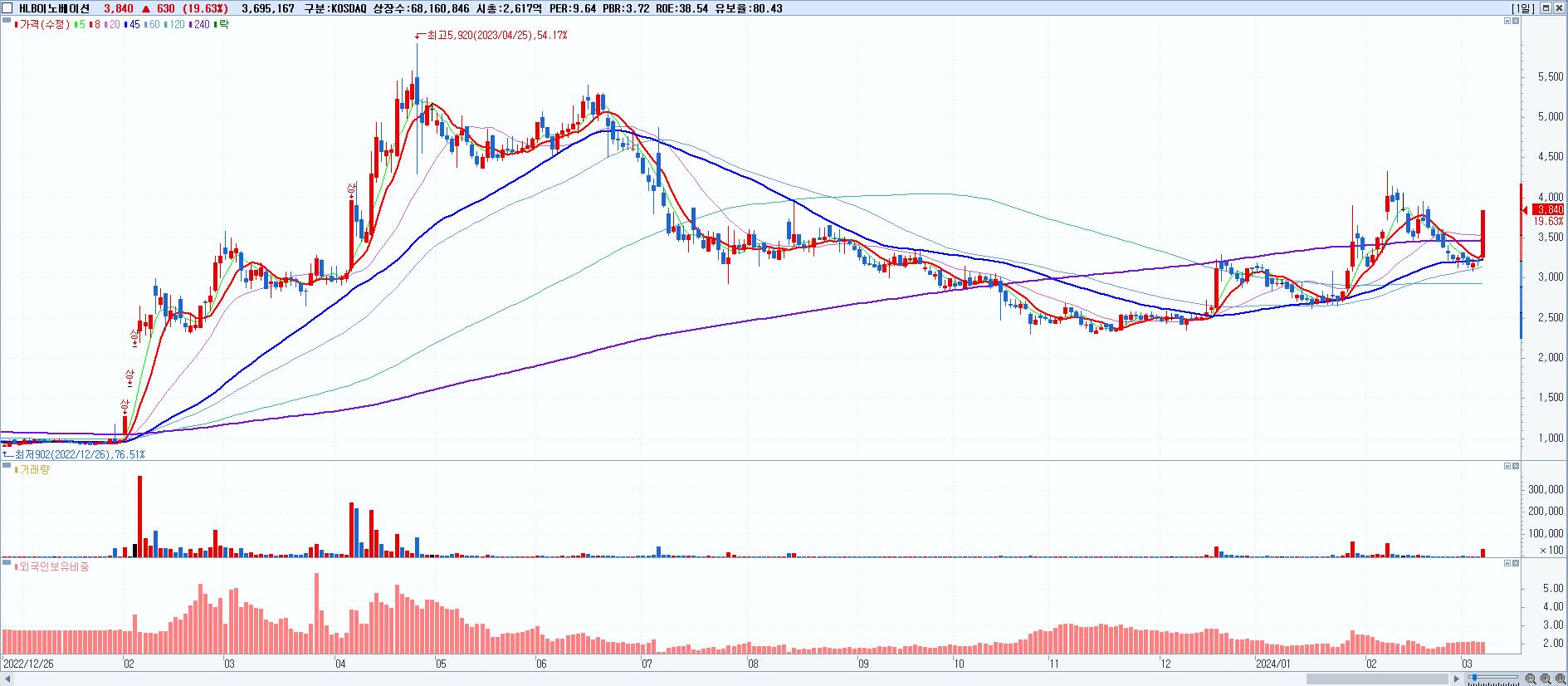 - HLB이노베이션 (3,840원 ▲ 19.63% , 시총: 2,617억, 거래량: 3,695,167, 거래대금:134억)
