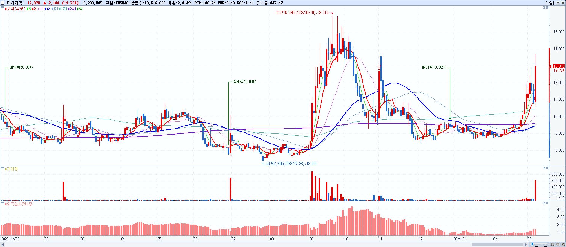 - 대화제약 (12,970원 ▲ 19.76% , 시총: 2,415억, 거래량: 6,283,085, 거래대금:803억)
