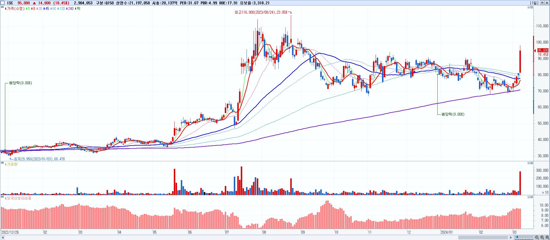 - ISC (95,000원 ▲ 18.45% , 시총: 20,137억, 거래량: 2,904,053, 거래대금:2,678억)