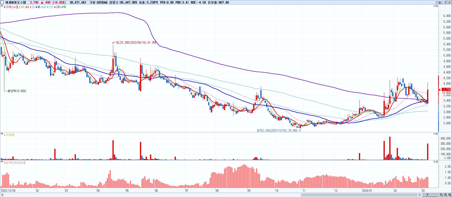- HLB바이오스텝 (3,790원 ▲ 14.85% , 시총: 3,238억, 거래량: 30,671,661, 거래대금:1,190억)