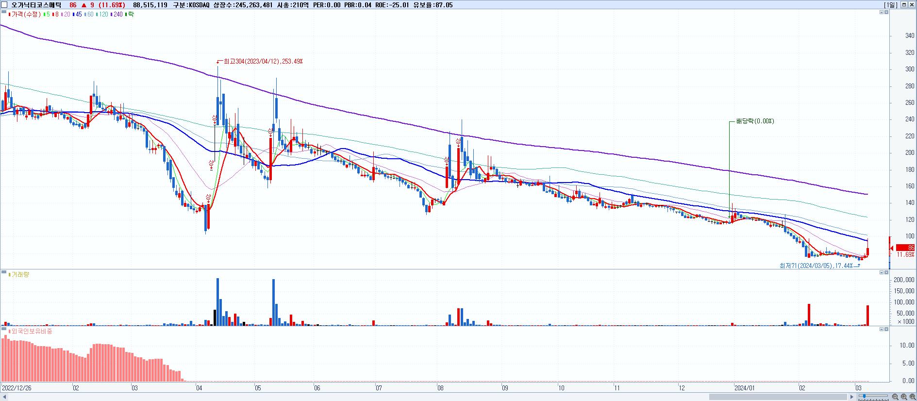 - 오가닉티코스메틱 (86원 ▲ 11.69% , 시총: 211억, 거래량: 88,515,119, 거래대금:80억)