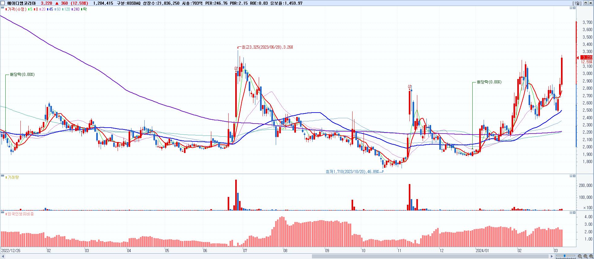 - 에이디엠코리아 (3,220원 ▲ 12.59% , 시총: 703억, 거래량: 1,204,415, 거래대금:37억)