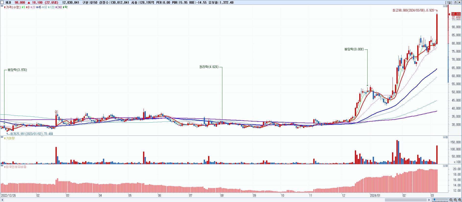 - HLB (98,000원 ▲ 22.65% , 시총: 128,196억, 거래량: 12,830,841, 거래대금:11,814억)