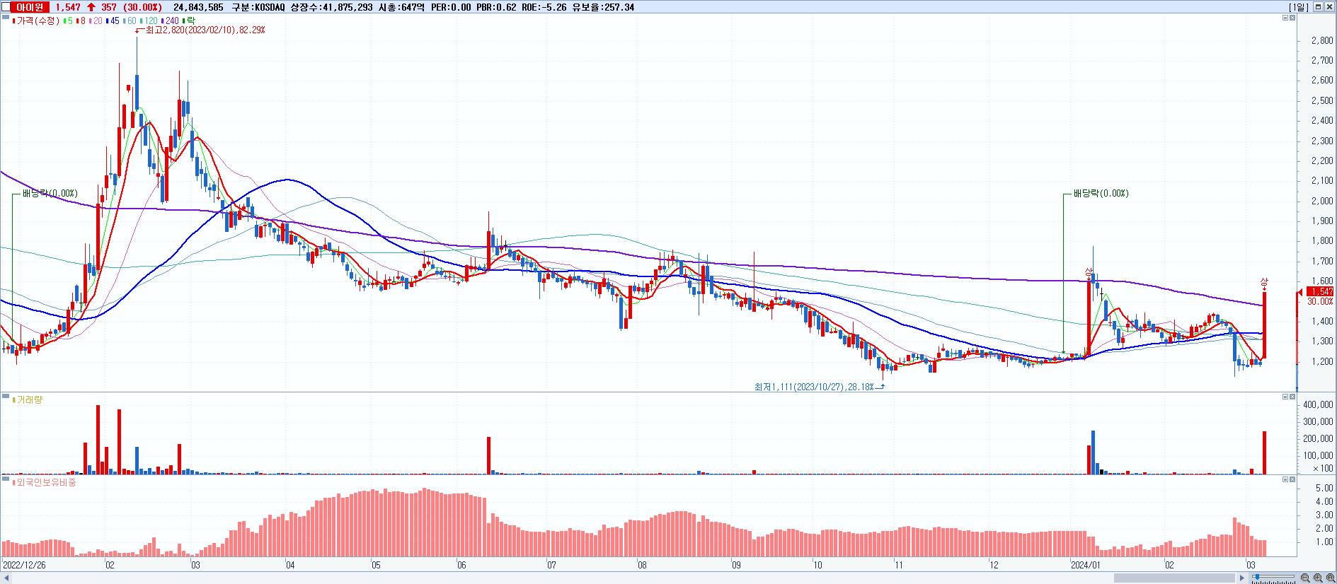 1.아이윈 1,547원 ▲ 30% (KOSDAQ, 090150)