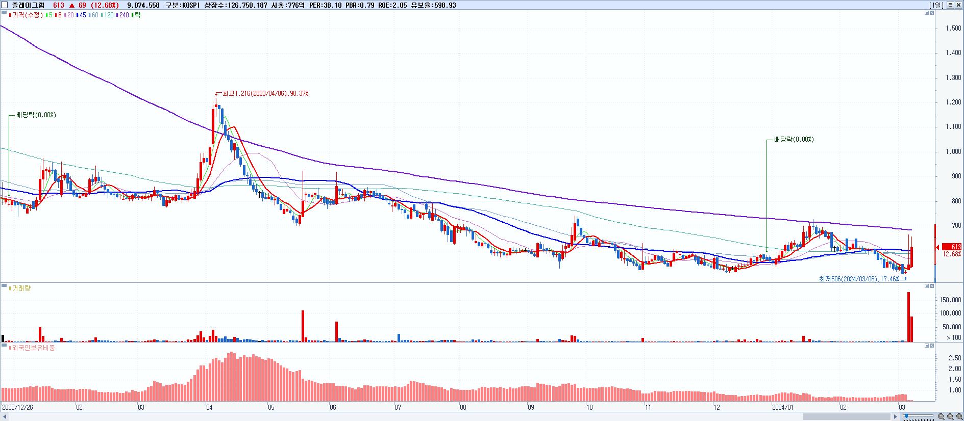 - 플레이그램 (613원 ▲ 12.68% , 시총: 777억, 거래량: 9,074,558, 거래대금:55억)