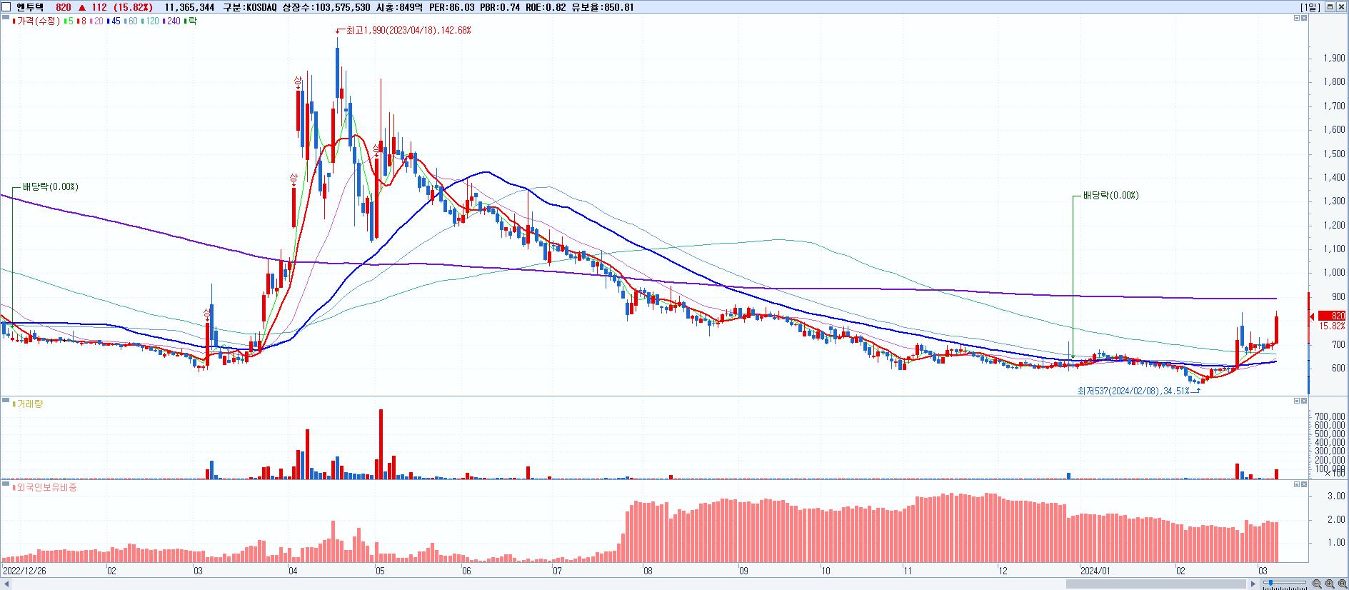 - 엔투텍 (820원 ▲ 15.82% , 시총: 849억, 거래량: 11,365,344, 거래대금:90억)