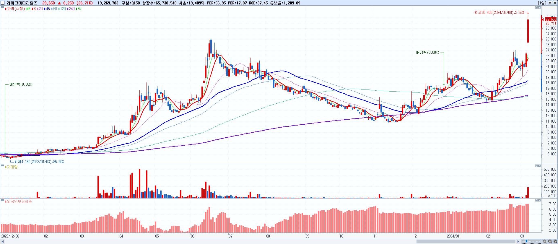 - 레이크머티리얼즈 (29,650원 ▲ 26.71% , 시총: 19,489억, 거래량: 19,269,783, 거래대금:5,550억)