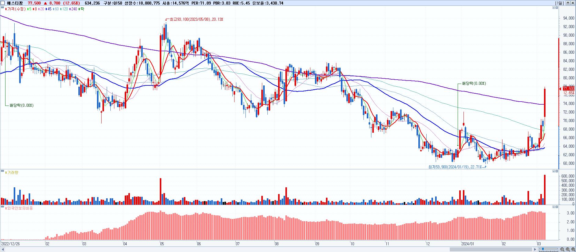 - 에스티팜 (77,500원 ▲ 12.65% , 시총: 14,577억, 거래량: 634,236, 거래대금:474억)