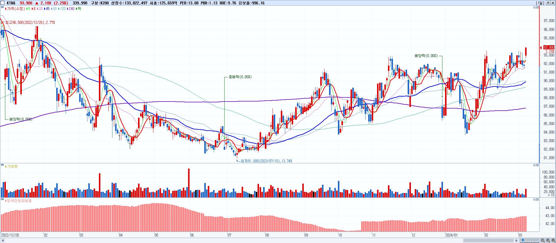 - KT&G (93,900원 ▲ 2.29% , 시총: 125,659억, 거래량: 339,990, 거래대금:319억, KOSPI)