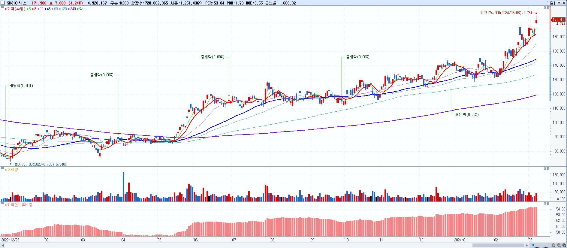- SK하이닉스 (171,900원 ▲ 4.24% , 시총: 1,251,436억, 거래량: 5,076,647, 거래대금:8,751억, KOSPI)