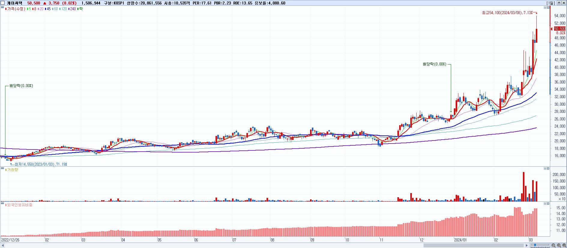 - 케이씨텍 (50,500원 ▲ 8.02% , 시총: 10,535억, 거래량: 1,506,944, 거래대금:758억, KOSPI)