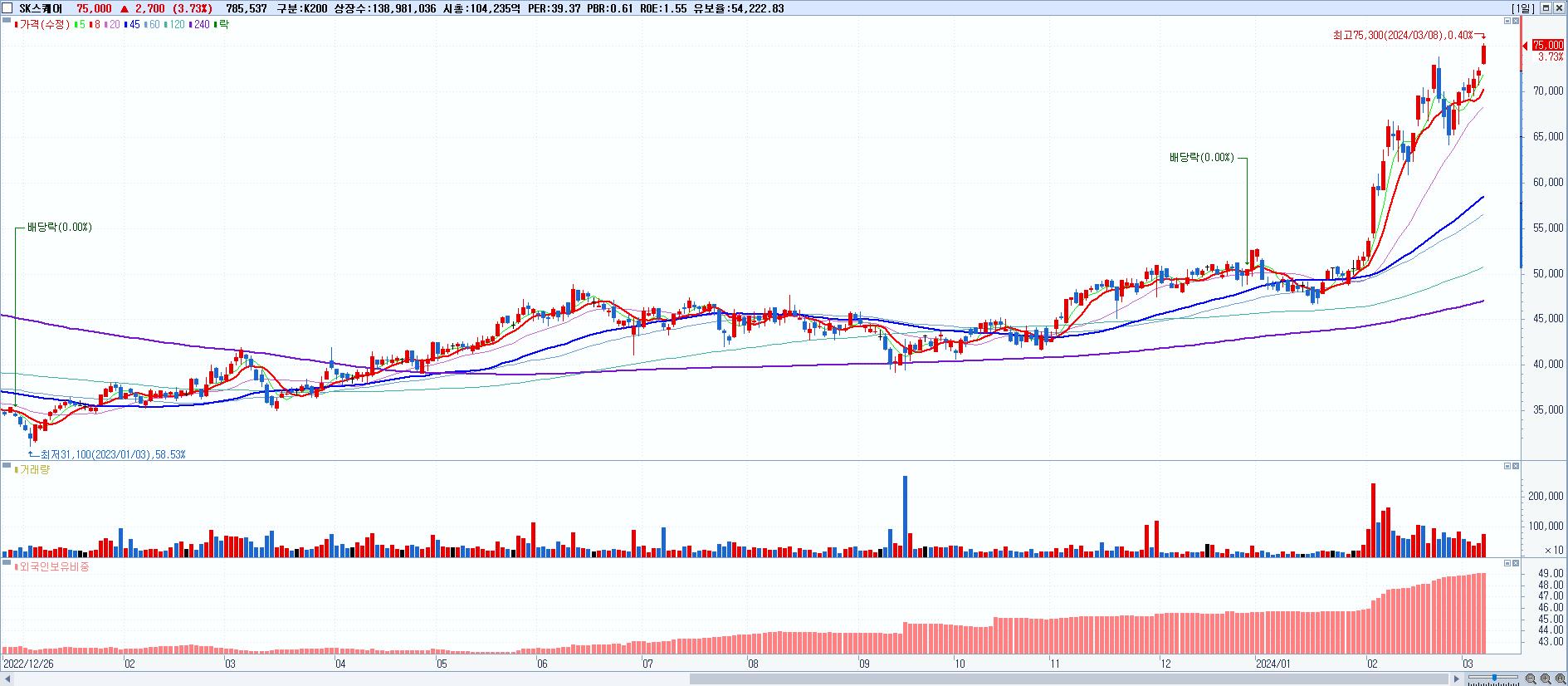 - SK스퀘어 (75,000원 ▲ 3.73% , 시총: 104,236억, 거래량: 785,537, 거래대금:586억, KOSPI)