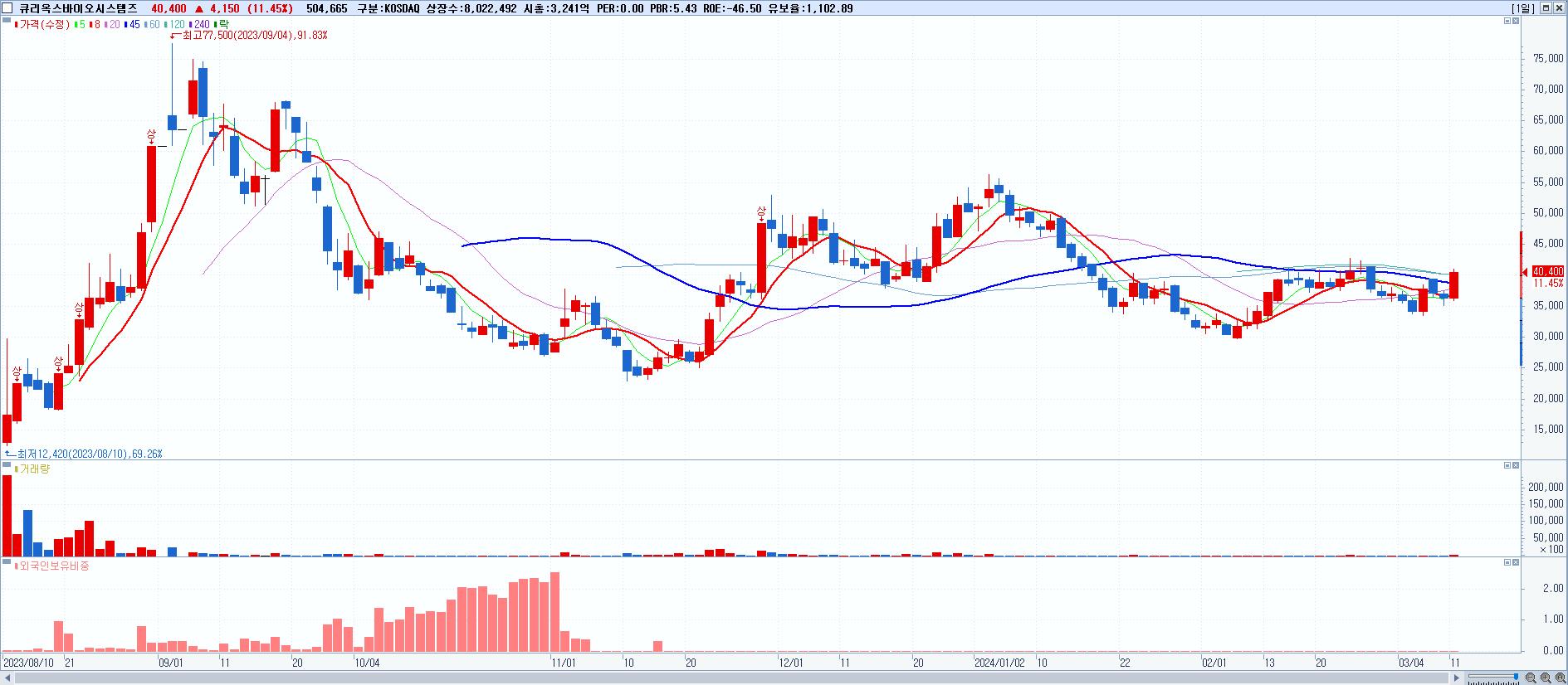 - 큐리옥스바이오시스템즈 (40,400원 ▲ 11.45% , 시총: 3,241억, 거래량: 504,665, 거래대금:198억)