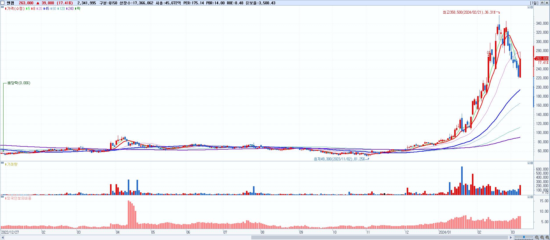 - 엔켐 (263,000원 ▲ 17.41% , 시총: 45,673억, 거래량: 2,341,995, 거래대금:6,037억)