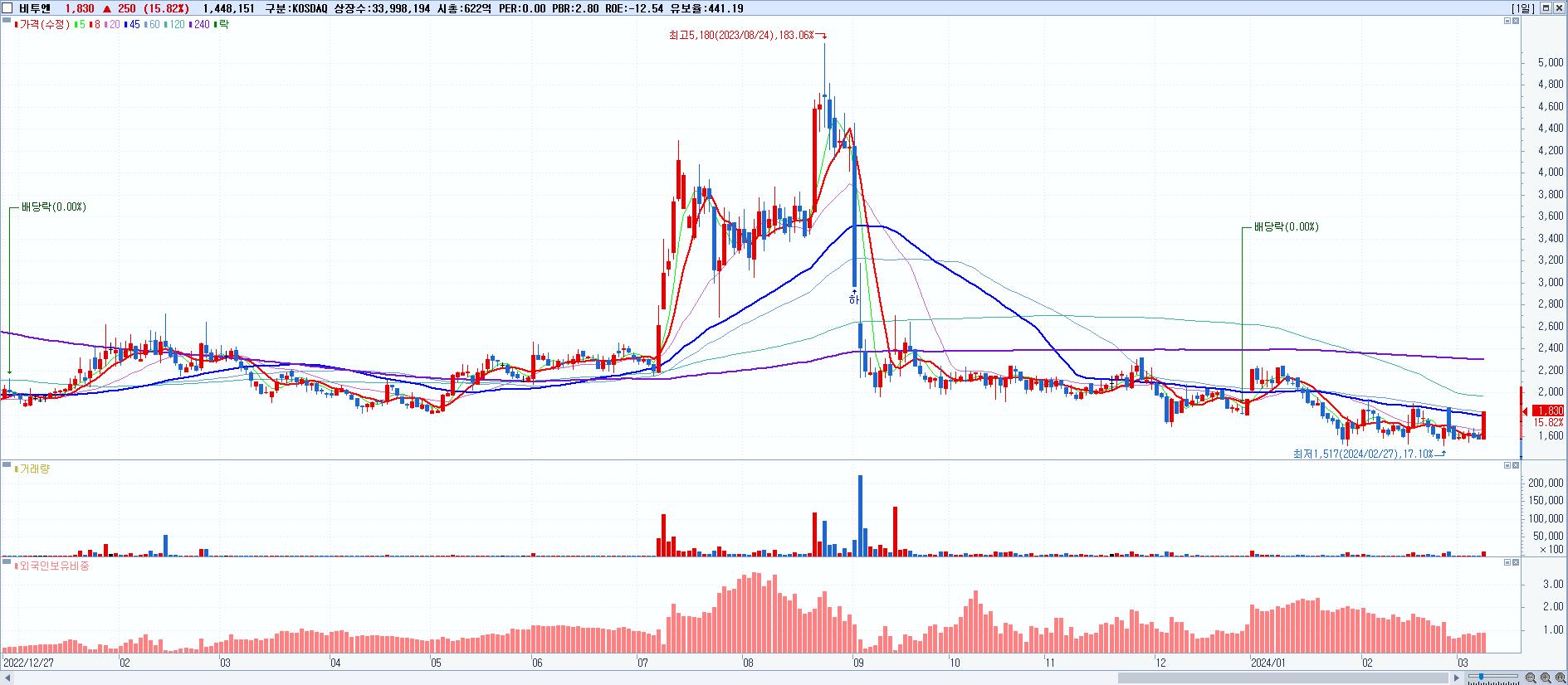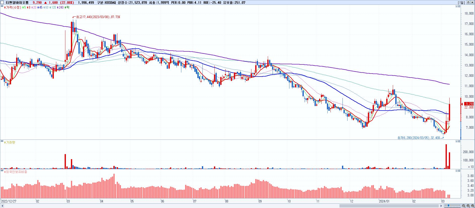 시총: 1,243억 거래량: 14,059,696 거래대금:628억