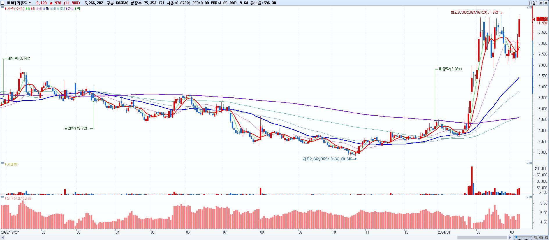 - HLB테라퓨틱스 (9,120원 ▲ 11.9% , 시총: 6,872억, 거래량: 5,266,202, 거래대금:461억)