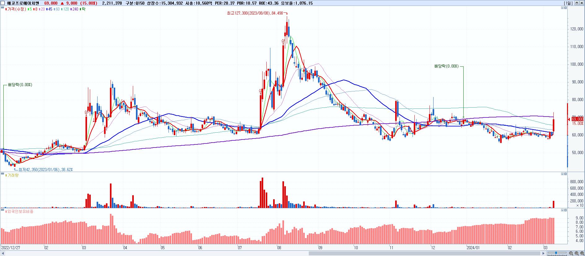 - 에코프로에이치엔 (69,000원 ▲ 15% , 시총: 10,560억, 거래량: 2,211,378, 거래대금:1,539억)