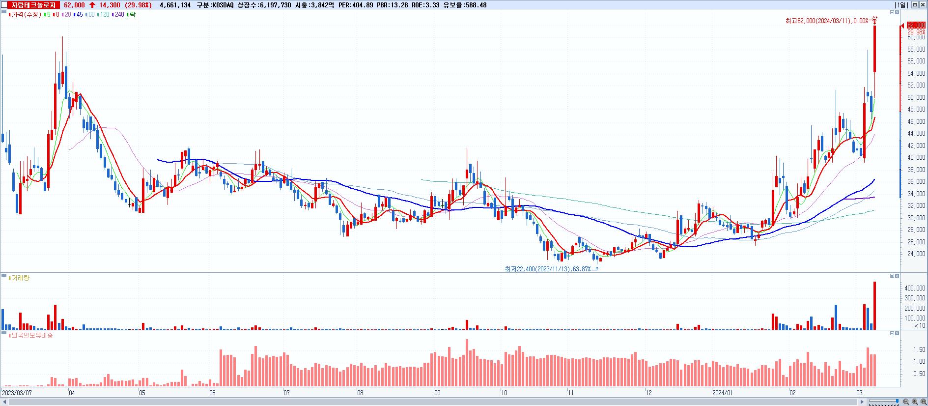 - 자람테크놀로지 (62,000원 ▲ 29.98% , 시총: 3,843억, 거래량: 4,661,134, 거래대금:2,632억)