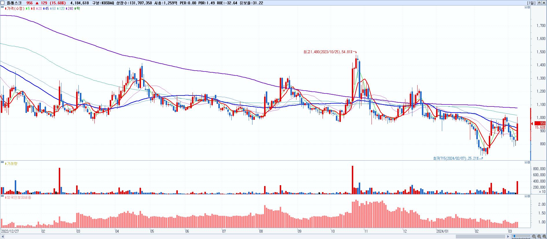 - 플래스크 (956원 ▲ 15.6% , 시총: 1,259억, 거래량: 4,184,618, 거래대금:40억)