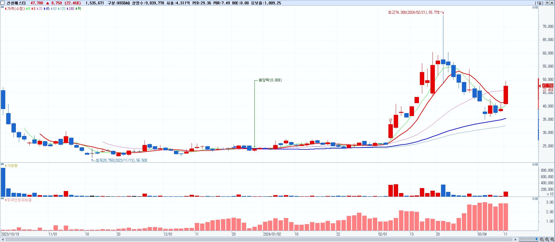 - 신성에스티 (47,700원 ▲ 22.46% , 시총: 4,312억, 거래량: 1,535,671, 거래대금:723억)