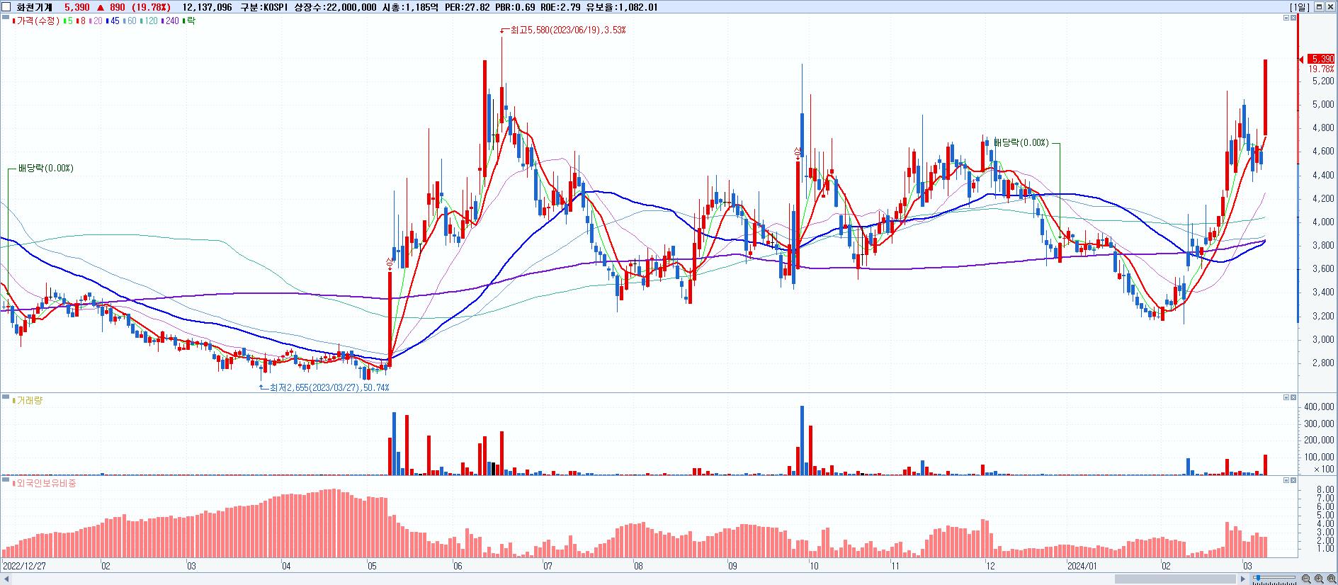 - 화천기계 (5,390원 ▲ 19.78% , 시총: 1,186억, 거래량: 12,137,096, 거래대금:618억)