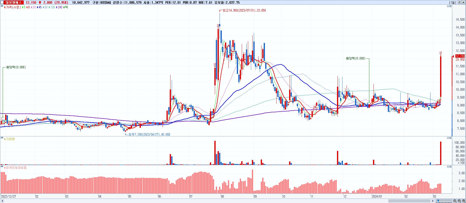 - 대봉엘에스 (12,150원 ▲ 29.95% , 시총: 1,347억, 거래량: 10,642,977, 거래대금:1,195억)