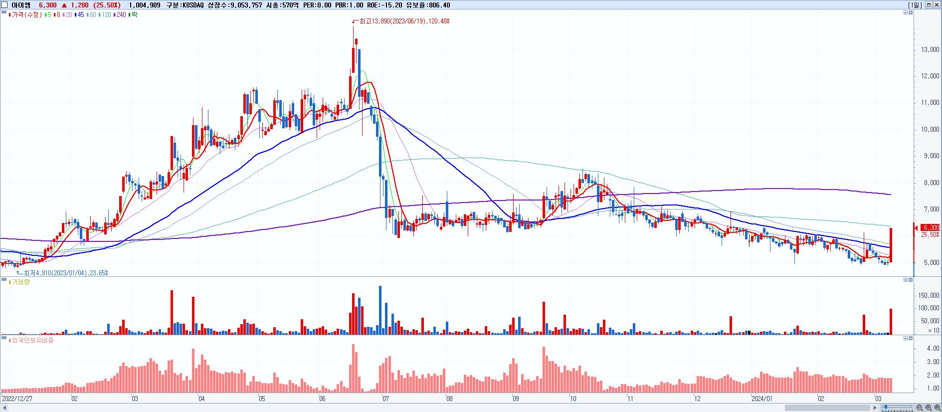 - 아이엠 (6,300원 ▲ 25.5% , 시총: 570억, 거래량: 1,004,909, 거래대금:58억)