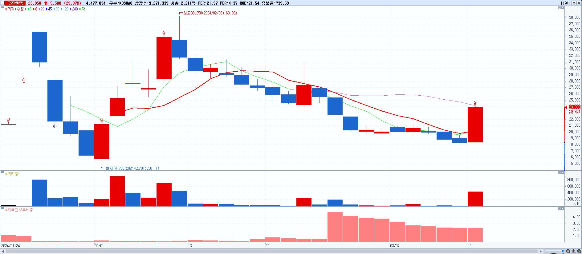 2.우진엔텍 23,850원 ▲ 29.97% (KOSDAQ, 457550)