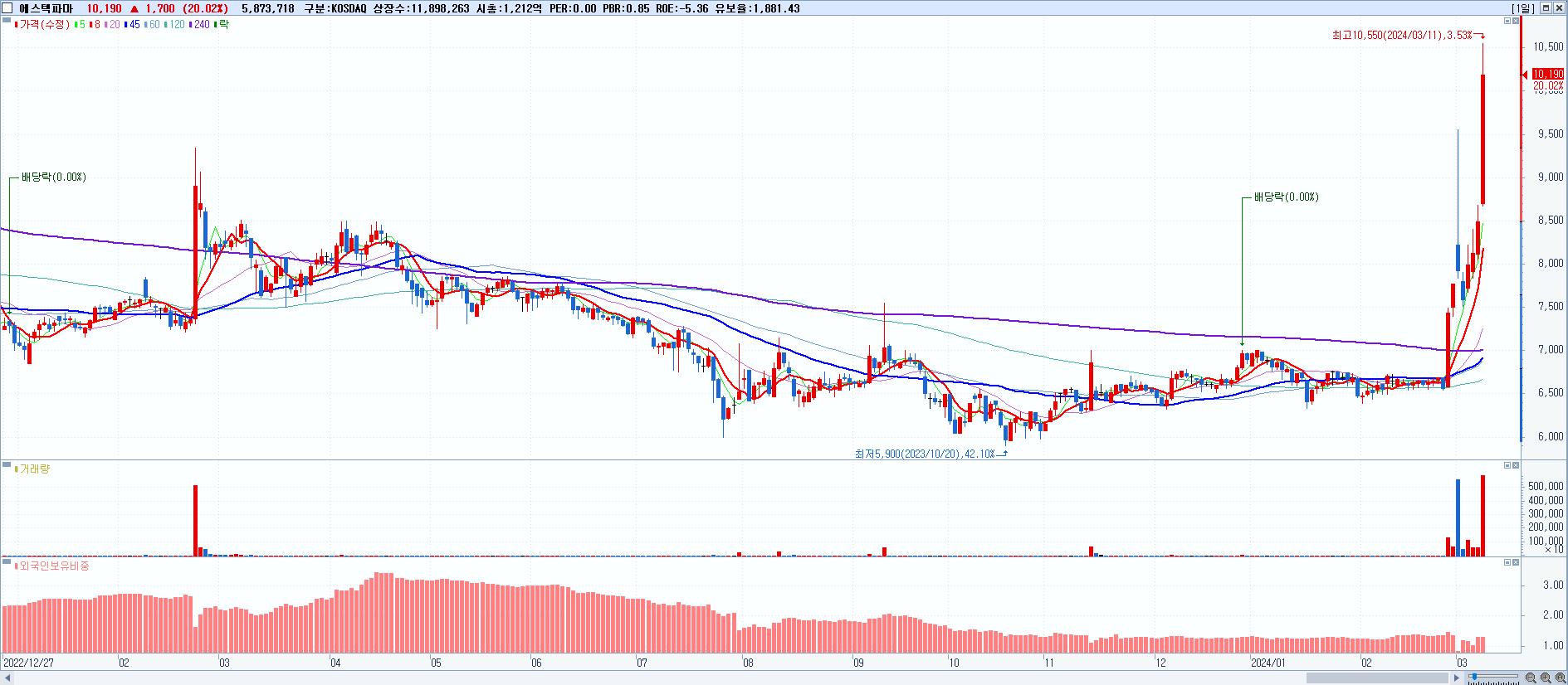 - 에스텍파마 (10,190원 ▲ 20.02% , 시총: 1,212억, 거래량: 5,873,718, 거래대금:582억)