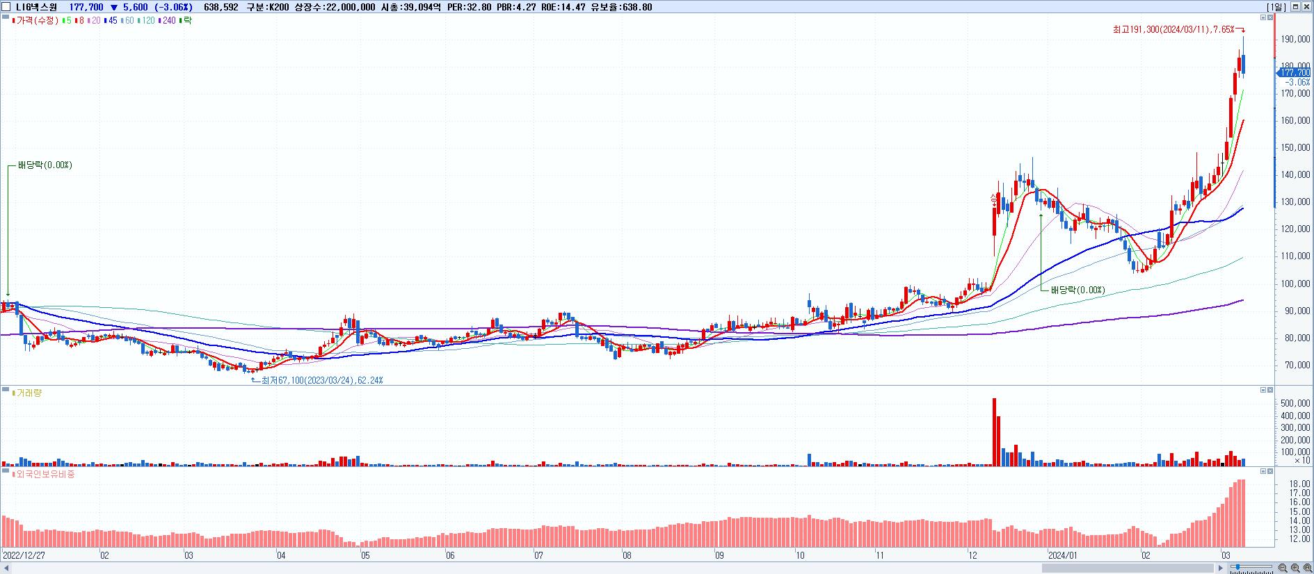 - LG이노텍 (194,900원 ▲ 3.23% , 시총: 46,127억, 외국인 순매수 거래금:122억)