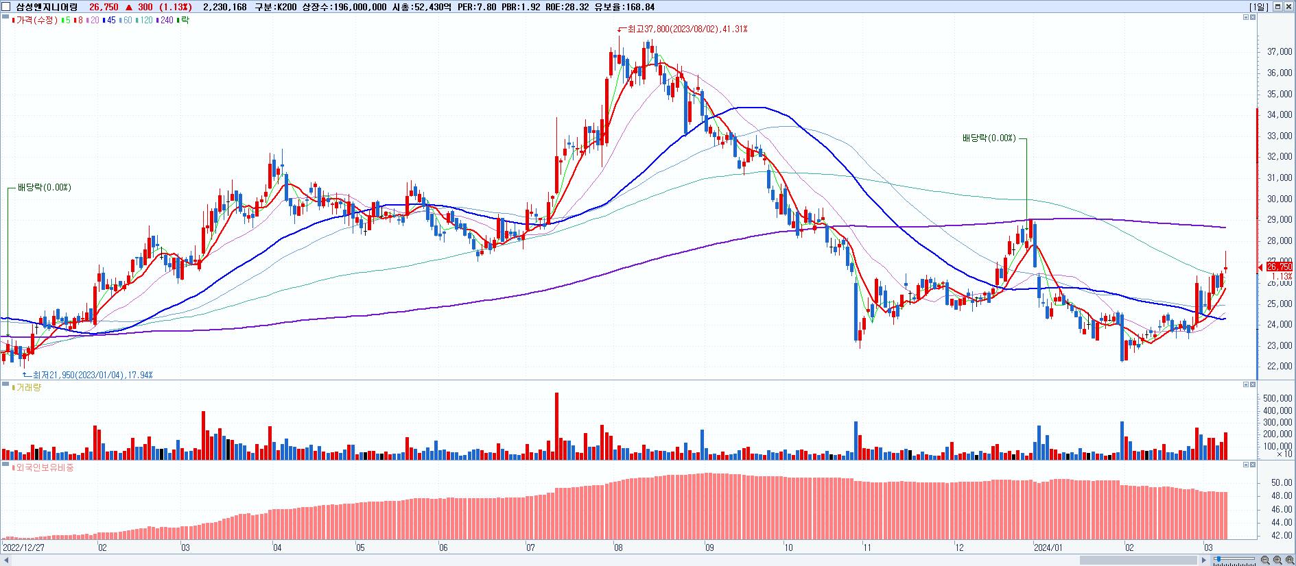 - 삼성엔지니어링 (26,750원 ▲ 1.13% , 시총: 52,430억, 외국인 순매수 거래금:119억)