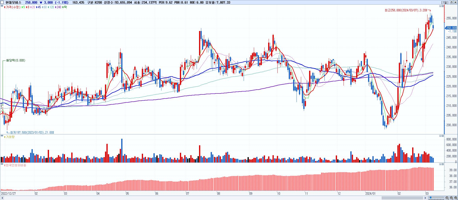 - 현대모비스 (250,000원 ▼ -1.19% , 시총: 234,138억, 외국인 순매수 거래금:114억)