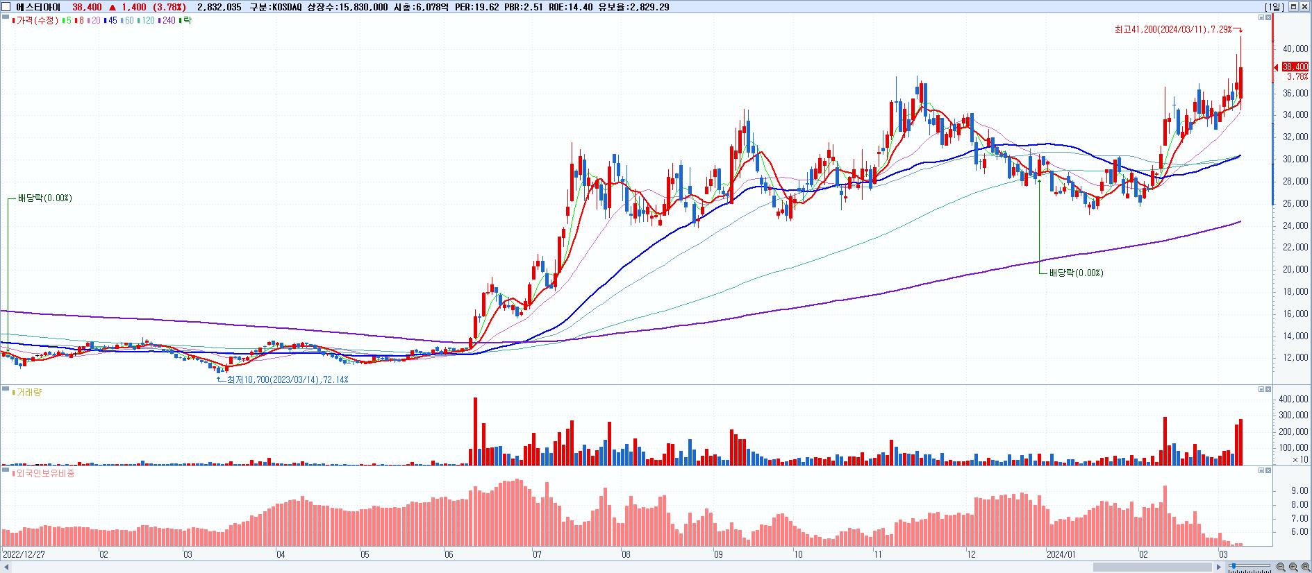 - 에스티아이 (38,400원 ▲ 3.78% , 시총: 6,079억, 외국인 순매수 거래금:45억)