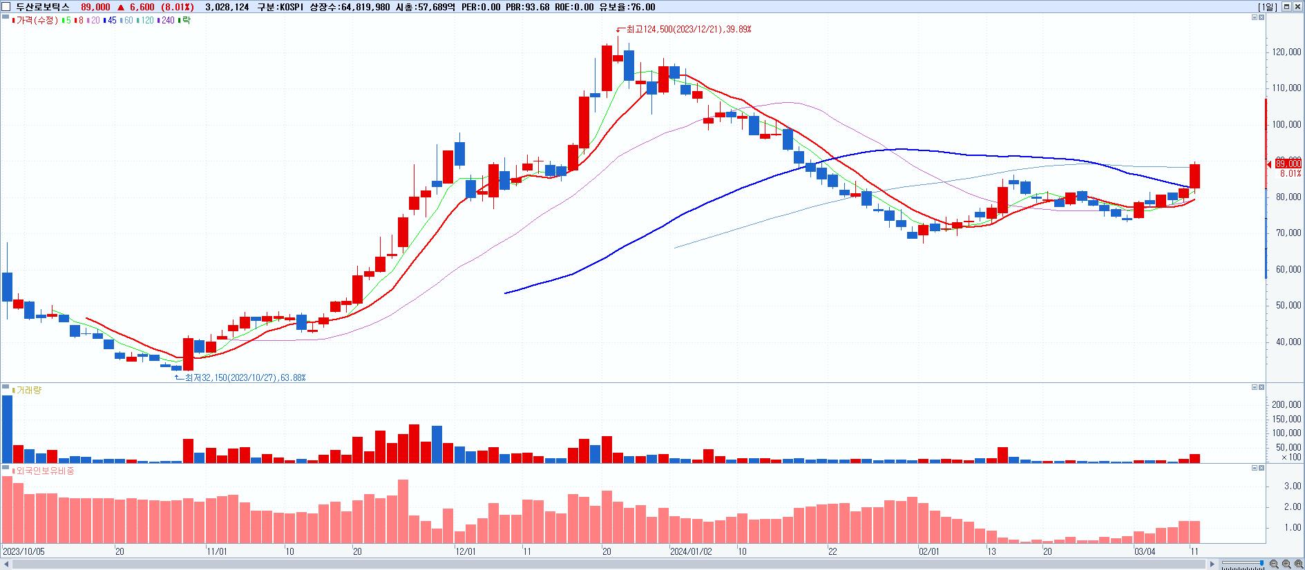 - 두산로보틱스 (89,000원 ▲ 8.01% , 시총: 57,690억, 외국인 순매수 거래금:311억)