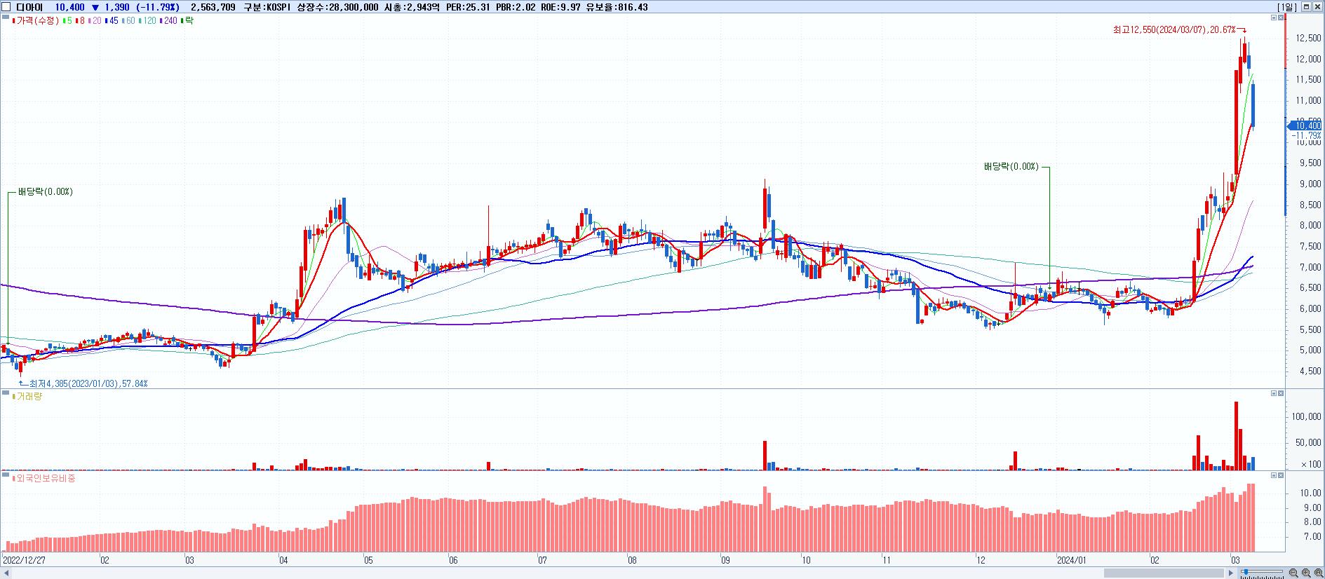 - 디아이 (10,400원 ▼ -11.79% , 시총: 2,943억, 외국인 순매수 거래금:50억)
